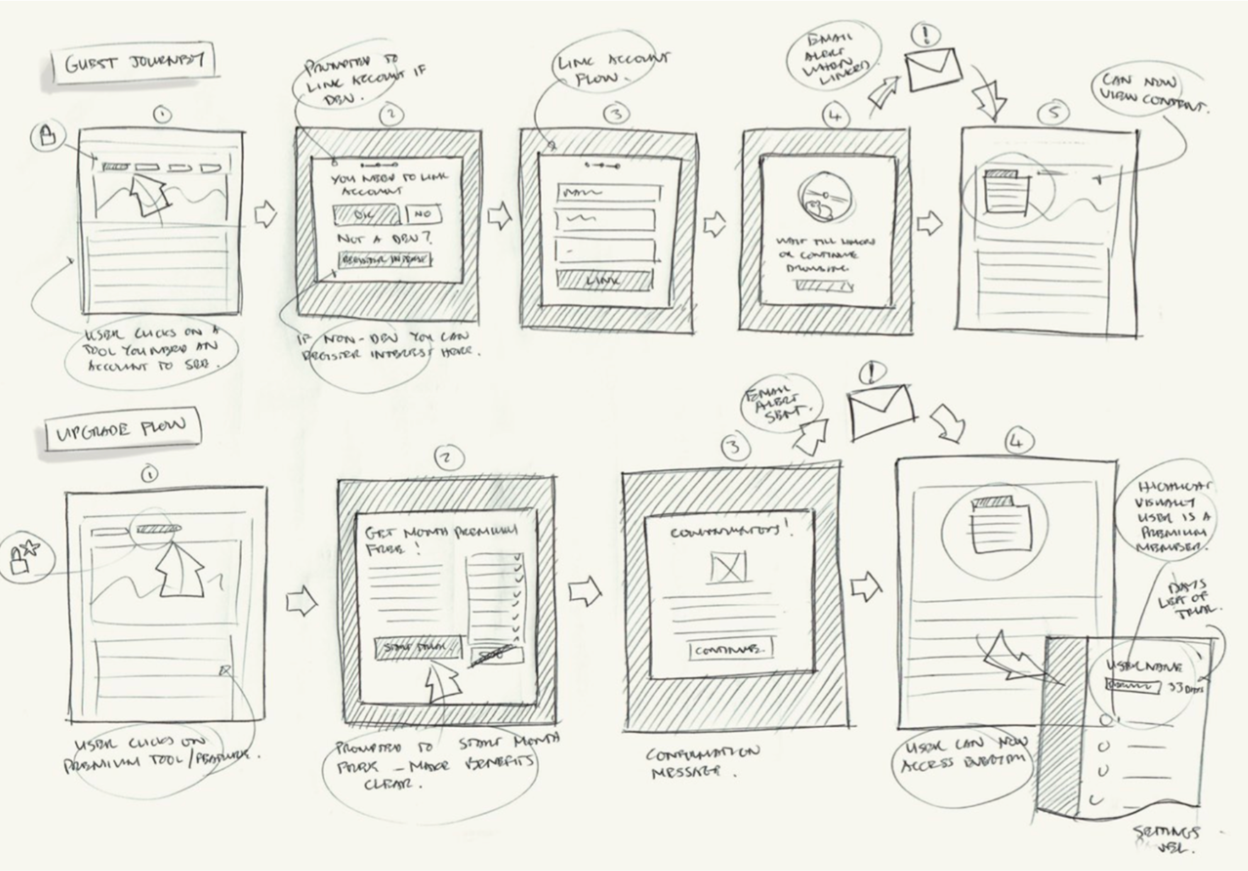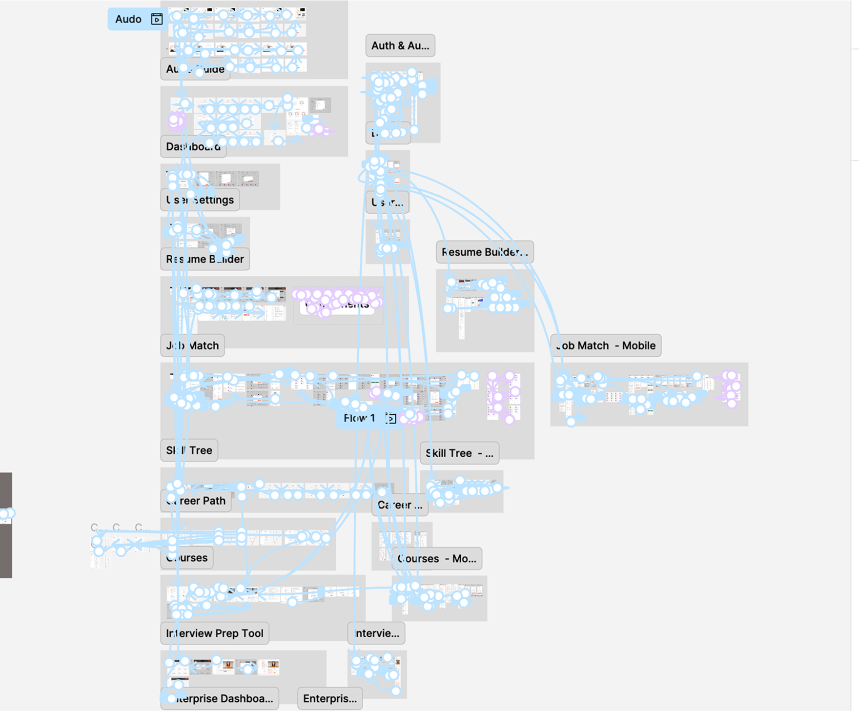 To lay the foundation for Audo’s product design, I began with wireframes that moved from quick paper sketches into shared Miro boards. This collaborative stage brought together AI developers, content strategists, and executive leadership, allowing us to align on structure and flow before any pixels were pushed. By iterating as a group, we ensured that every screen reflected both user needs and the broader mission of helping people feel confident in their career journeys.