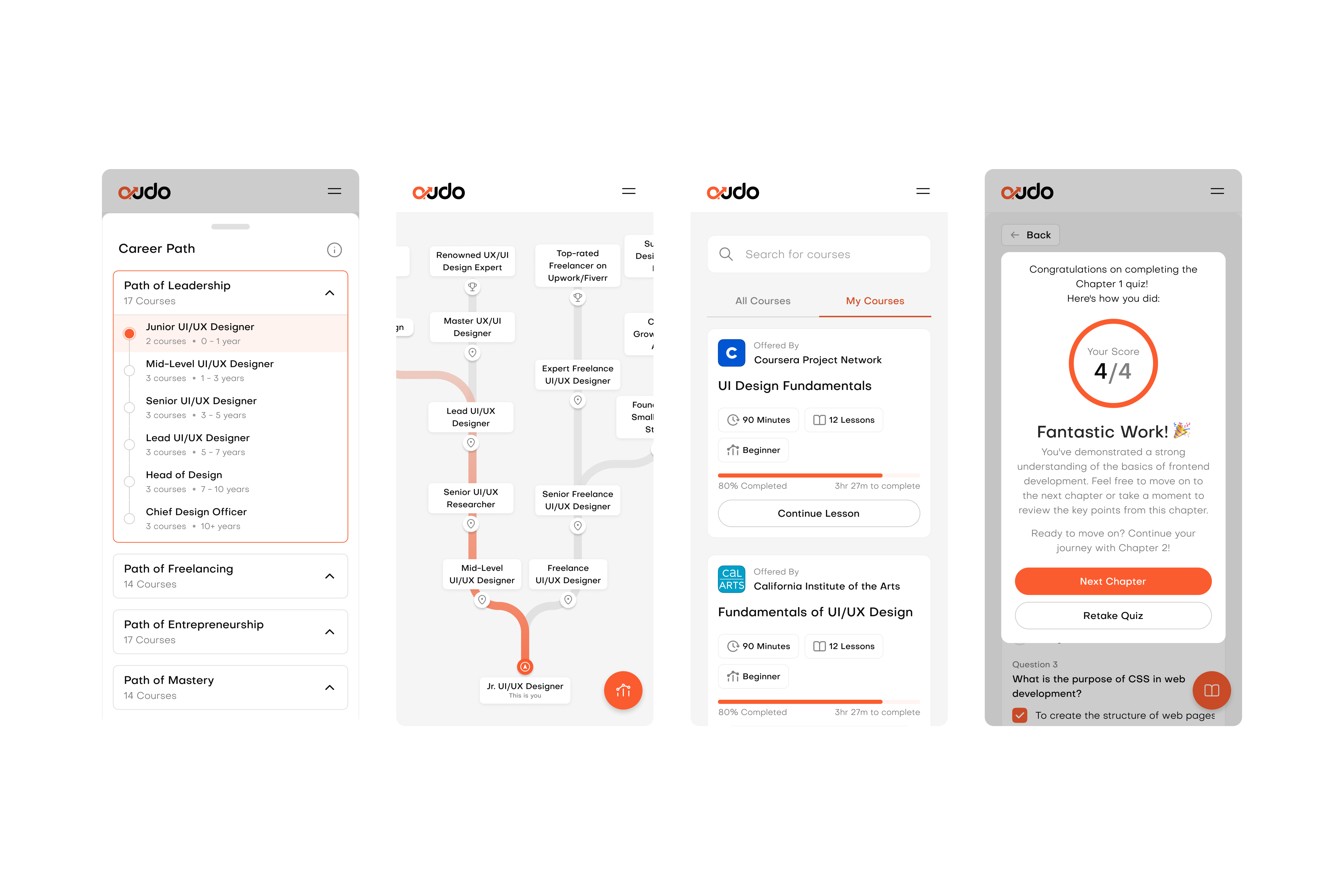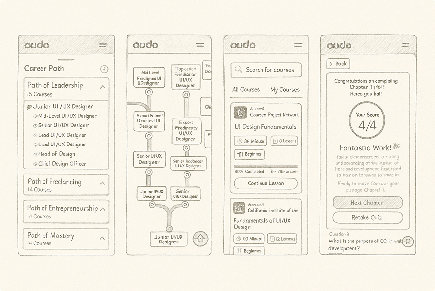 The Audo product design project allowed me to shape the foundation of a platform that helps people navigate their careers with confidence. I grounded my design decisions in user research, focusing on easing career anxiety, creating accessible experiences for a diverse range of users, and ensuring that AI-driven recommendations were transparent and ethically responsible.