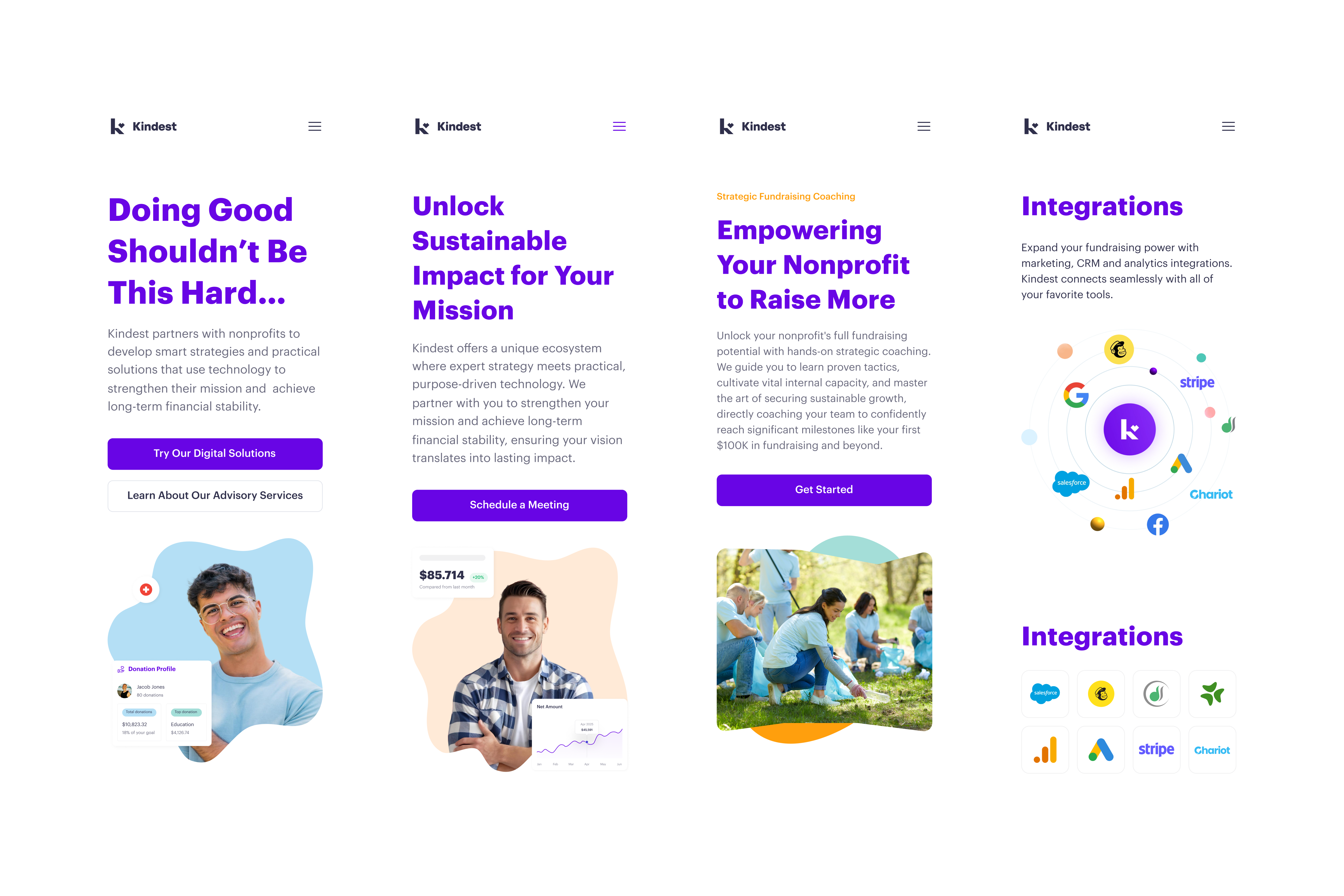 A redesigned website highlighting Kindest’s full consulting services and integrating their suite of tools and resources to help non-profits access support and guidance more efficiently.